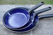 Satz emaillierte Bratpfannen 1950erPfannen: Satz von drei Gusseisen-Bratpfannen in versch. Größen, innen blau emailliert. Verfügbarkeit: 1 x Satz Pfannen in dieser...