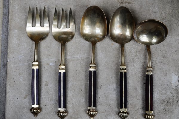 Besteck: Vollständiges, 90 Teile nordisches Designerbesteck, hier Messing mit Palisanderholzeinlagen: Skandinavien der 1970er Jahre. Verfügbarkeit: 90 Teile wie folgt: 12 x Suppenlöffel; 12 x Dessertlöffel; 12 x Teelöffel; 12 x große Gabeln; 12 x Dessertgabeln; 12 x große Messer; 12 x kleine Obstmesser; 4 x Vorlegelöffel, 2 x große Vorlegegabeln. Von insgesamt 90 Teilen fehlt eine Gabel.