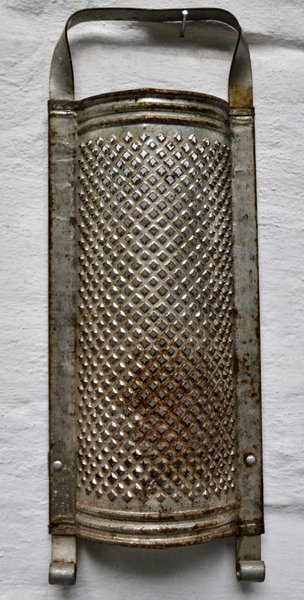 Großmutters Küchenausstattung: Einfache, stabile Universal-Küchenreibe bzw. Raspel mit Bügelhenkel. Maße: 27 cm L; 11 cm B; 4 cm H. Gewicht: 150 Gramm. Verfügbarkeit: 2 x in dieser Ausführung; weitere Hobel, Küchenraspeln und Reiben in anderen Materialien.