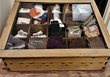 Vitrine: Hölzerne Tischvitrine / Verkaufsvitrine für Strümpfe, hier mit angeschrägtem Glasdeckel und Geldschublade hinten. Die Vitrine hat insgesamt 20 vertiefte Fächer für alte Strumpfpaare mit Preisschildchen aus den 1930-50er Jahren. Verfügbarkeit: 1 x in dieser Ausführung, weitere Vitrinen.