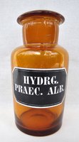 Apothekengefäß: Braunes Lichtschutzglas mit pharmazeutischer Bezeichnung in weißer Schrift auf schwarzen Grund "HYDRG. PRAEC. ALB." Eingeschliffener Pilzstopfen. Maße: 8 cm Bodendurchmesser; 17 cm H. Leergewicht: 610 Gramm. Verfügbarkeit: 1 x in dieser Ausführung, weitere Arzneiflaschen mit unterschiedlichen Bezeichnungen.