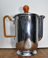 Sahnegießer: 0,25 Liter dekoratives Art Déco Sahnekännchen mit bernsteinfarbenem Bakelitknopf und intaktem geglättetem Rohr- umwickeltem Henkel. Die verchromte Oberfläche ist stellenweise korrodiert, was der Schönheit keinen Abbruch tut. Maße: 5,5 cm Bodendurchmesser; 13 cm H. Gewicht: 140 Gramm. Verfügbarkeit: 1 x in dieser Ausführung, weitere Sahnegießer / Milchgießer / Milchkännchen.