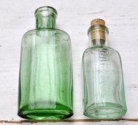 Flaschen: Zwei Arzneifläschchen, hier kleine, grüne Pressglasfläschchen für Arzneien / Tropfen - eimal mit der Aufschrift CARDINOL- Maße: 9 x 4 cm. Gewicht: 50 Gramm. Verfügbarkeit: 2 x ; weitere Arzneiflaschen.