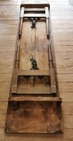 Tisch: Antiker zusammenklappbarer Künstler-Ateliertisch mit sehr schöner Patina, hier 250 cm lange schmale Holzplatte auf ausklappbaren Beinen. Verfügbarkeit: 1 x in dieser Ausführung weitere Tische.