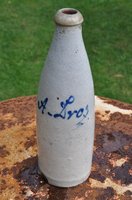 Alte Berliner Weißbierflasche: 0,75 L mit blauem Schriftzug auf weißem Grund: "A. Groz." Maße: 8 cm Durchmesser; 26 cm H. Gewicht: 900 Gramm. Verfügbarkeit: 15 x in ähnlicher Ausführung mit anderen Namenszügen.