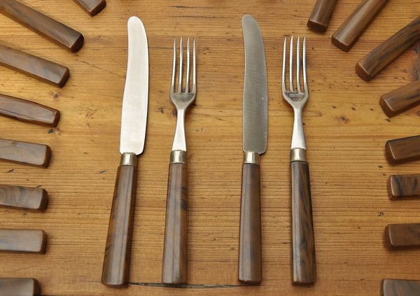 Besteck der 1950er Jahre: 12 x Gabeln und 12 x Messer Campingbesteck, rostfreier Stahl mit marmorierten Kunststoffgriffen. Gewicht: 24 Teile = 1 Kg. Verfügbarkeit: hier 12 x Gabeln; dazu 12 x Messer.