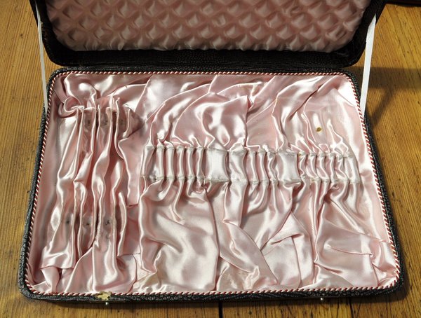 Besteckkasten: Besteckkasten für 24 Besteckteile, hier in "Echsen-Optik", hier mit rosa Kunstseide ausgeschlagen. Das Innenfutter ist leicht angeschmutzt. Maße: 35 x 25 x 7 cm. Leergewicht: 800 Gramm. Verfügbarkeit: 1 x in dieser Ausführung; 2 x in ähnlicher Ausführung; weitere Besteckkästen.