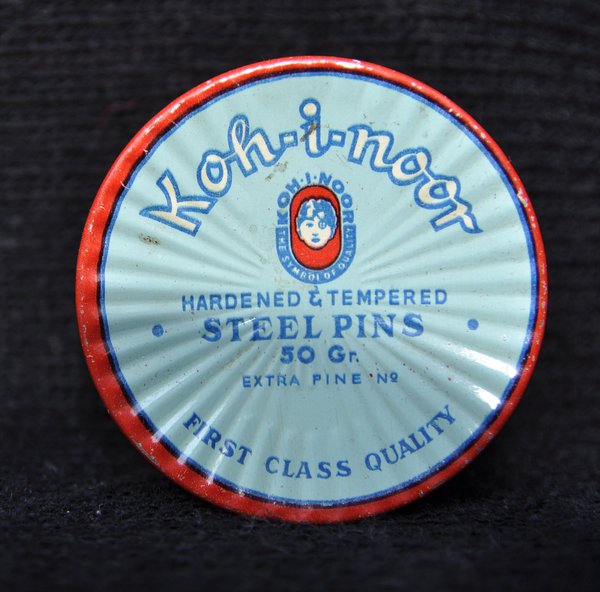 Engl. Produktdose: Kleine runde, farblithografierte Blechdose "Koh-i-noor" ursprünglich für Stecknadeln. Gewicht: Gramm. Verfügbarkeit: 1 x in dieser Ausführung; weitere Blechdosen mit Reklameaufdrucken, ferner Nähzeug und Nähutensilien für die Schneiderin.