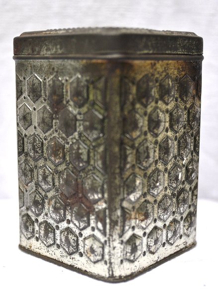 Blechdose: Viereckige, neutrale Allzweck-Weißblechdose der 1950er Jahre mit geprägten "Waben" und Auschrift "KONSUM UND SPARVEREIN REUTLINGEN". Maße: 8,5 x 8,5 cm; 13 cm H. Gewicht: 130 Gramm. Verfügbarkeit: 1 x in dieser Ausführung; ferner weitere alte Blechdosen / Gebäckdosen / Kaffeedosen / Teedosen in diversen Größen.