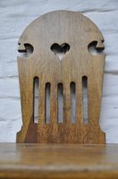 Derber Eichenholz Brettstuhl: Anfang 20. Jh. mit ausgeschnittener Rückenlehne "Lyra" und Herz. Maße: 45 cm B; 47 Sitzhöhe; 92 Gesamthöhe. Verfügbarkeit: 1 x in dieser Ausführung; weitere Brettstühle / Schemelstühle aus Eiche.