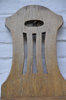 Derber Eichenholz Brettstuhl: Anfang 20. Jh. mit ausgesägter Rückenlehne. Maße: 45 cm B; 47 Sitzhöhe; 90 Gesamthöhe. Verfügbarkeit: 1 x in dieser Ausführung; ferner ähnliche Brettstühle / Schemelstühle aus Eiche.