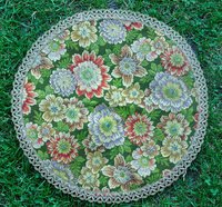 Zierdeckchen 1960er Jahre: Rundes Brokat-Zierdeckche mit Goldlitze für Salon- und Beistelltische - auch unter Glas zu legen. Einwandfreier Zustand. Maße: 38 cm Durchmesser. Gewicht: 50 Gramm. Verfügbarkeit: 1 x in dieser Ausführung; weitere Spitzendecken / Zierdeckchen.