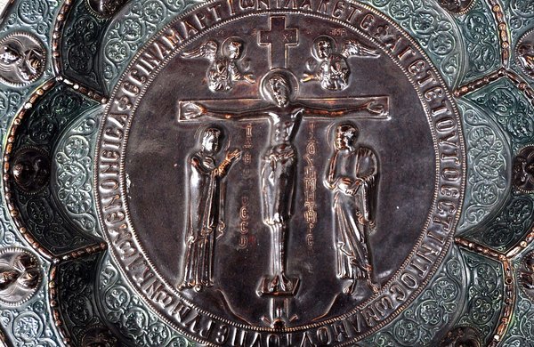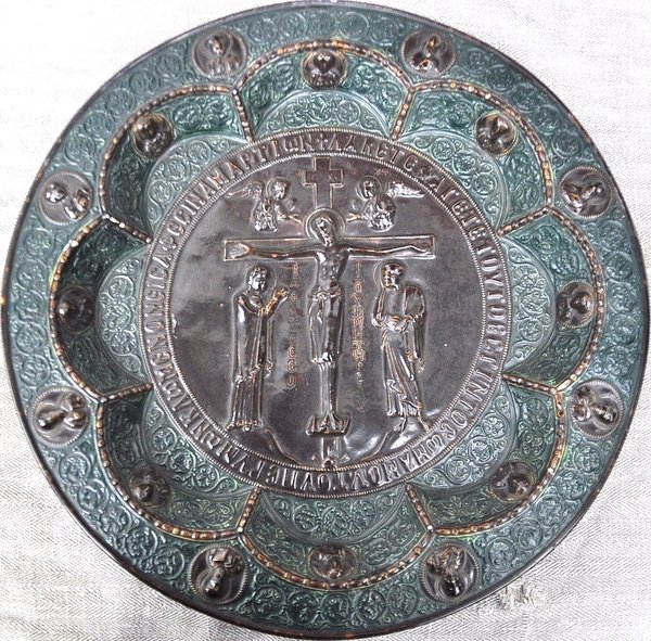 Replik: Sehr seltene, alte Nachbildung der achtpassigen, byzantinischen Weihbrotschale aus dem 11. Jh. aus dem Halberstädter Domschatz. Die Original Weihbrotschale ist aus Silber / vergoldet und kam als Raubgut aus Byzanz als Geschenk Kaiser Otto I. an den Halberstädter Dom. Maße: 37 cm Durchmesser; 5 cm H. Gewicht: 1800 Gramm. Verfügbarkeit: 1 x in dieser Ausführung; weitere Kreuzigungsgruppen.
