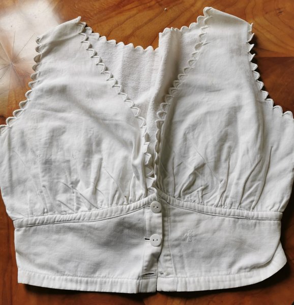 Bustier: Altmodisches Bustier oder Halbmieder aus Baumwollstoff mit Mausezacken-Paspel der 1920er/30er Jahre. Verfügbarkeit: 1 x in dieser Ausführung.