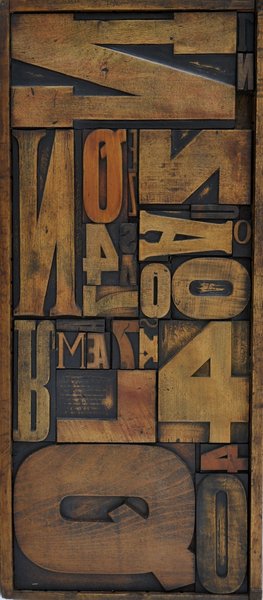 Wandbild: Buchstaben-Collage aus verschiedenen Buchstaben im alten Drucker-Setzkasten. Gewicht: 5250 Gramm. Unikat.