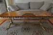 Tisch: Großer repäsentativer Couchtisch mit geschliffener Halbedelsteinplatte auf verstrebtem, verziertem Messinggestell. Maße: 160 cm L; 60 cm B; 53 cm H. Verfügbarkeit: 1 x in dieser Ausführung.