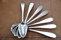 Löffel: 7 x elegante, lange Dessertlöffel mit spitz zulaufender Laffe. Die Löffel sind auf dem Griff mit den Buchstaben A. P. monogrammiert. Rückseitiger Silber-Stempel wie folgt "12 BEHNKE". Maße: 18 cm L; 3 cm B. Gewicht: Satz 170 Gramm. Verfügbarkeit: 7 x als Satz; ferner 6 x ähnliche Kaffeelöffel Teelöffel. Ausleih-Wochenpreis: 28.- Euro.