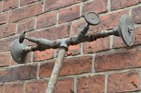 Schrott: Zink-Duschkopf mit Gestänge und Anschlüssen aus einem Gefängnis der 1930er Jahre. Guter, originaler Erhaltungszustand.
