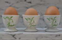 Küche der 1920er Jahre: 3 kelchförmige, weiße Eierbecher mit aufgelegten Schneeglöckchen. Maße: 5 cm Durchmesser; 5 cm H. Gewicht: 3 x 60 Gramm. Verfügbarkeit: 3 x in dieser Ausführung; weitere Eierbecher aus dieser Serie.