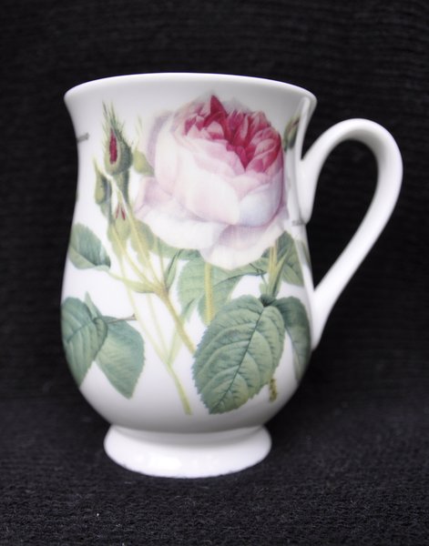 Tasse: Neuzeitliche Kakaotasse mit zarter Bemalung "Rosier Rosa muscosa multiplex", siehe Bodenstempel wie folgt "Redouté Roses / Roy Kirkham / England 2006 / Fine Bone China". Maße: 7,5 cm Durchmesser Öffnungsrand; 11 cm H. Gewicht: 190 Gramm. Verfügbarkeit: 1 x in dieser Ausführung; weitere Tassen.