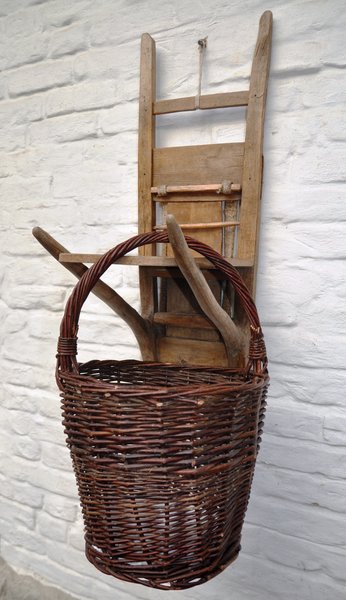 Korb: Derber runder Bügelkorb aus dunklem Weidengeflecht. Gewicht: 700 Gramm. Verfügbarkeit: 1 x in dieser Ausführung; weitere Körbe / Henkelkörbe.