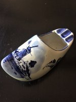 Aschenbecher: Fayence Aschenbecher "Delfter Blau" in Form eines Holzschuhs mit Stempel"Krone für Kgl. Delft / Handpainted / Holland". Verfügbarkeit: 1 x in dieser Ausführung, weitere Aschenbecher und Objekte in Delfter Blau. Aussleihpreis: 12,50 Euro.
