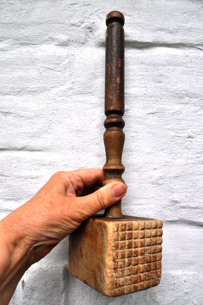 Fleischklopfer: Urgroßmutters Küchenausstattung mit "Küchenhelfern", hier einfacher, hölzerner Fleischklopfer bzw. Holzklotz mit zweiseitig beschnitzter Zackenfläche. Maße: 34 cm L; 7 cm B. Gewicht: 300 Gramm. Verfügbarkeit: 3 x in dieser Ausführung, weitere Fleischklopfer.