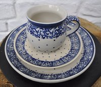 Gedeck: Ein Bunzlau-Keramik-Gedeck "Schwämmelmuster". Maße: 20 cm Durchmesser Teller. Gewicht: 900 Gramm 1 Gedeck. Verfügbarkeit: 1 x in dieser Ausführung; weitere Kaffeegedecke, dazu 3 weitere identische Tassen / Becher. ohne Teller.