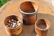 Drei Hohlmaße zum Abmessen von Getreide à 1/4 L; à 1/2 L und à 1 Liter aus Bugholz rund gebogen und mit Eisennägeln genietet. Das 1 L Maß hat zur weiteren Verstärkung Eisenbändern und trägt den Brandstempel D.R. für Deutsches Reich. Die drei Hohlmaße passen ineinander. Verfügbarkeit: 4 x unterschiedliche Maßeinheiten und Ausführungen, s. Einzelbeschreibungen unter der Rubrik Bauer & Magd. Lit.: Gertrud Benker "Altes bäuerliches Holzgerät" erschienen im Callwey Verlag, München 1976