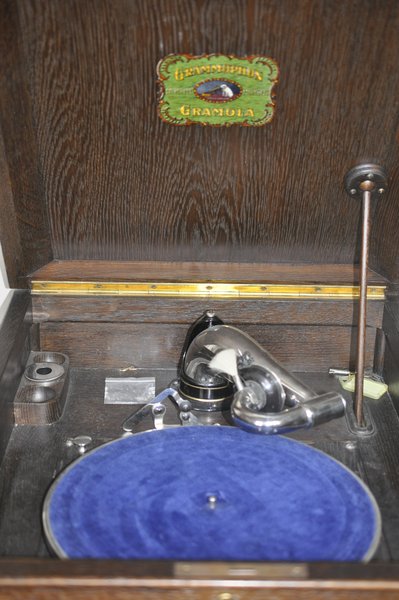Musikschrank: Voll funktionstüchtiges Grammophon "GRAMOLA", hier eingebaut in einen mit Durchbruchschnitzerei verzierten Eichenholz-Grammophonschrank mit Aufstelldeckel am Teleskopstab. Eine große Auswahl an Schellackplatten und neuwertige Grammophonnadeln sind vorhanden. Der Musikschrank ist in einem Top Zustand, selbst der Schlüssel zum Schrank ist vorhanden. ** Verfügbarkeit: 1 in dieser Ausführung; weitere Grammophone. Ausleihgebühr bis zu 3 Monaten: 150 Euro.