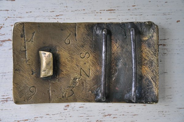 Schnalle: Original-Gürtelschnalle der Renaissance, hier große gegossene Bronze-Gürtelschließe eines Metzgers. Die reliefierte Schnalle zeigt eine Schlachtszene, wie das Schlachten im Mittelalter üblich war. Die Schnalle ist rückseitig graviert und monogrammiert 1693 / S . Z. Maße: 11 cm L; 6 cm B. Gewicht: 100 Gramm. Verfügbarkeit: 1 x in dieser Ausführung; weitere Gürtelschließen / Gürtelschnallen.