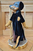 Handpuppe "Dackel". Von Hand gefertigter und bemalter Pappmascheekopf "Dackel". Fantasievolle Bekleidung mit schwarzem Fell aus Samtstoff. Maße:32 cm H; 12 cm B des Kopfes. Gewicht: 200 Gramm. Verfügbarkeit: 3 x Handpuppen aus dieser Serie: Dackel, Pfau und Fuchs.