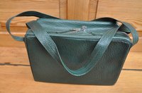 Handtasche: Ärmliche Damen Handtasche der Kriegs- bzw. Nachkriegszeit, hier geräumige, grüne "Umhängetasche" aus Kunstleder im Straußenlederlook. Zwei Reißverschlüsse, die mittig zusammenlaufen. Langer Schulterriemen. Gewicht: 850 Gramm. Verfügbarkeit: 1 x in dieser Ausführung; weitere Damen Handtaschen aus den 1930/40er Jahren.