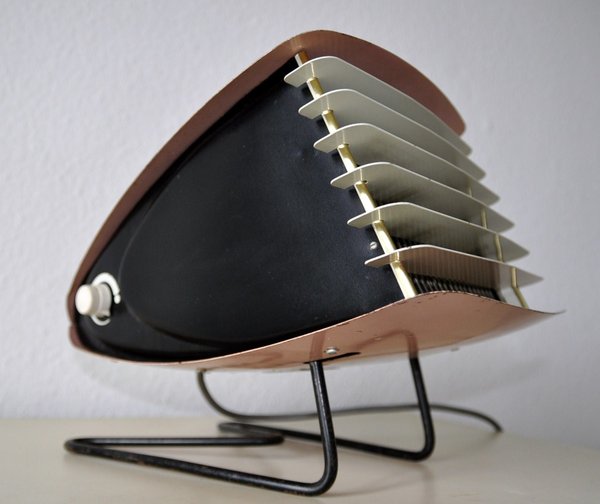Heizlüfter 1950er: Stromlinienförmiger, mehrfarbig, jedoch überwiegend rosa lackierter Heizlüfter der Firma JUNKER & RUH mit weißen Lamellen. Einwandfrei funktionstüchtig und sehr gut erhalten. Der passende Stecker mit Elektroschnur ist vorhanden.* Verfügbarkeit: 1 x in dieser Ausführung; weitere Heizlüfter / Heizsonnen / Heizstrahler und Öfen.