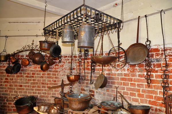 Großküche: Hier die historische Knastküche in einem ehemaligen Untersuchungsgefängnis aus dem Jahre 1911. Die historische Küche ist um eine fest gemauerte Feuerstelle / Kocherd variabel mit Kücheneinrichtungsgegenständen um die Jahrhundertwende zum 20. Jh. ausgestattet oder nach Wunsch mit Küchenutensilien bis 1950 umzugestalten. Küchenrequisiten vom mittelalterlichen Grapen bis zum Schnellkochtopf (Marke Eigenbau) aus der Nachkriegszeit sind im Fundus vorhanden. Anmerkung: Die Erlaubnis des Bezirksschornsteinfergers zur Wieder-Inbetriebnahme der Herdstelle für Filmzwecke liegt vor.