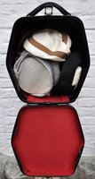 Schlichter, sechseckiger Hutkoffer der 1960er Jahre im Nappaleder- imitierenden Look zum staubfreien Aufbewahren von Damen- und Herrenhüten. Einwandfreies, rotes Moirée-Innenfutter. Guter, hygienischer Erhaltungszustand. Der Schlüssel zum Schloss fehlt. Gewicht: 2000 Gramm. Verfügbarkeit: 1 x in dieser Ausführung; weitere Hutschachteln und Haubenschachteln.
