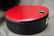 Koffer: Kleine, runde Hutschachtel mit Kosmetikfach an Handschlaufe im Straussenlederlook. Der kleine, runde Koffer hat Platz für einen so genannten "Pillenhut" oder ein Stewardessenbarett der 1960er Jahre. Innen ist die Hutschachtel zweigeteilt durch einen roten Lacklederdeckel mit Griffloch, so dass Hut und Kosmetikartikel voneinander getrennt sind. Sehr guter, unbenutzter Zustand.** Gewicht: 550 Gramm. Verfügbarkeit: 1 x in dieser Ausführung; weitere Hutschachteln, Hutkoffer und Haubenschachteln.