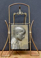 Rahmen: Jugendstil Aufstell-Bilderrahmen bzw. leichte Draht-Metallmontierung zum Aufbewahren / Abhängen von Großvaters Taschenuhr - hier eindekoriert mit dem Selbstbildnis eines jungen Mannes (Brillenträger) und der Jahresangabe 1908 in der Bronzeplatte. Verfügbarkeit: 1 x