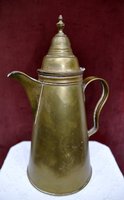 Kaffeekanne / Ratzeburg: Sogenannte "Türkenkanne" 1. Häfte 19. Jh. Aus Messingblech getriebene Kaffeekanne, innen verzinnt. Auf dem geschwungenen Henkel befindet sich eine spätere Datierung mit folgender Widmung "H. Redenbürg 1868". Ein identisches Kaffeekannen-Exemplar ist nachgewiesen im Heimatmuseum Schönberg in Mecklenburg Vorpommern, s. Peesch/Rudolf "Mecklenburgische Volkskunst VEB E. A Seemann Verlag Leipzig 1988, S. 108 Maße: 14 cm Bodendurchmesser; 29 cm H. Gewicht: 650 Gramm. Verfügbarkeit: 1 x in dieser Ausführung; weitere Kaffeekannen, Messing Mokkakannen.