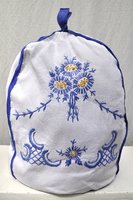 Handarbeit: Kaffeewärmer, hier weiße, blau abgepaspelte "Kaffeemütze" aus handgewebtem Leinen mit Blumen im Stil der 1930er Jahre bestickt. Maße: 34 cm B; 32 cm H. Gewicht: 300 Gramm. Verfügbarkeit: 1 x in dieser Ausführung; weitere Kaffeehauben / Kaffeewärmer / Kaffeemützen.