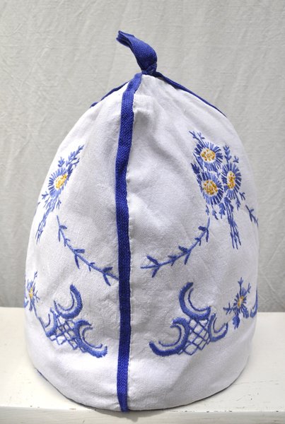 Handarbeit: Kaffeewärmer, hier weiße, blau abgepaspelte "Kaffeemütze" aus handgewebtem Leinen mit Blumen im Stil der 1930er Jahre bestickt. Maße: 34 cm B; 32 cm H. Gewicht: 300 Gramm. Verfügbarkeit: 1 x in dieser Ausführung; weitere Kaffeehauben / Kaffeewärmer / Kaffeemützen.