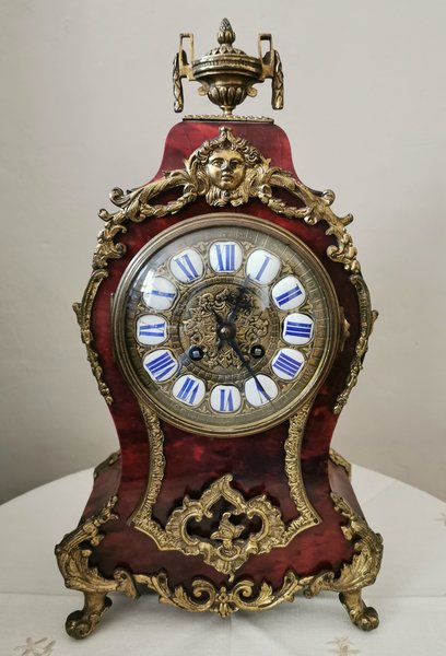 Uhr: Kaminuhr, hier gebauchter Edelholzkorpus im Empirestil mit Messingzifferblatt und aufgesetzten römischen Ziffern. Mittig oben eine Maskarone und Vasenbekrönung sowie verspielte Messing-Appliken. Verfügbarkeit: 1 x in dieser Ausführung; weitere Kaminuhren.