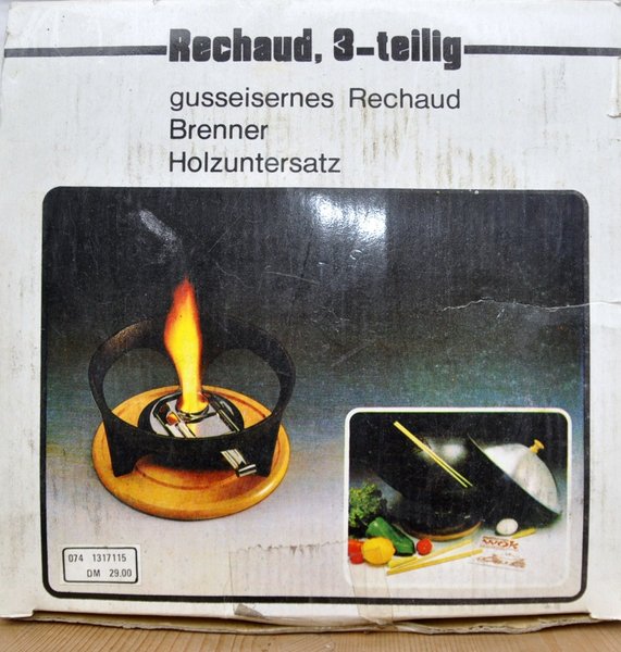 Fondue: Käse-Fonduetopf, ein sogenannter Caquelon, hier zum Gusseisen-Rechaud auf Holzuntersetzer. Die Hitze im Rechaud wird erzeugt auf der Basis von Brennpaste oder Spiritus. Maße Originalkarton: 23 x 23 x 13 cm. Gewicht Rechaud ohne Topf: 2750 Gramm. Verfügbarkeit: 1 x in dieser Ausführung, weitere Fonduetöpfe, Pfannen und Rechauds.