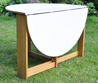 Tisch: Designer-Tisch, hier praktischer, raumsparender Klapptisch der 1960er Jahre nach dem Konstruktions-Vorbild englischer "Gate-leg-tables". Beidseitig abklappbare, weiße Resopalplatte getragen von vier über Kreuz miteinander verstrebten Beinen. Sehr guter Erhaltungszustand.* Verfügbarkeit: 1 x in dieser Ausführung, ferner ein originaler, engl. Gate-leg-table. Ausleihgebühr bis zu 3 Monaten: 62,50 Euro.