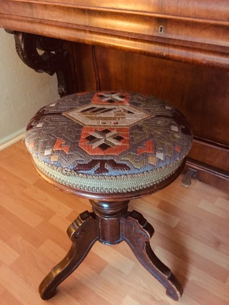 Hocker: Höhenverstellbarer Klavierhocker mit sekundär ergänztem Polster in Gobelinstickerei.