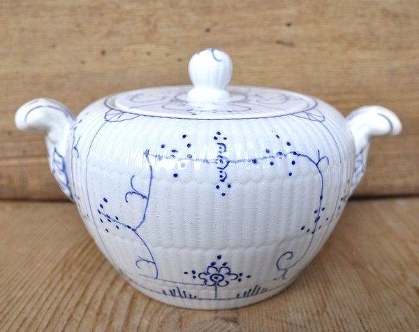 Zuckerdose: Bauchige Steingut Zucker-Deckeldose aus einem großen Kaffee- Teeservice der Firma Boch & Freres Belgien bzw. Villeroy & Boch / Dresden der 1920er Jahre - erst nach dem 2. WK in Belgien niedergelassen, hier 2 x Zuckerdosen, ferner 6 x großen Teetassen, 20 x Unterteller, diverse Kaffeetassen - alles im Muster "Relief gebrochener Stab mit blauer floraler Unterglasurmalerei im so genannten "Petersiliemuster". Keine Beschädigungen an den Zuckerdosen. Maße: 16 cm Durchmesser; 11 cm H. Gewicht: 320 Gramm. Verfügbarkeit: 2 x Zuckerdosen in diesem Muster, weitere Zuckertöpfe.