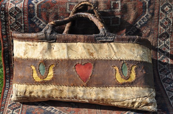 Museale Tasche zur Tracht: Sehr seltene Biedermeier Markt- bzw. Einkaufstasche aus Ziegenleder mit Lederapplikationen "Herz und Christusmonogramm IHS". Die Verbreitung der mit Lederapplikationen versehenen flachen Binsentaschen aus den ersten Jahrzehnten des 19. Jh. macht es wahrscheinlich, dass es für dieses modische Accessoires zur Tracht ein eigenes Produktionszentrum gab, das möglicherweise in Niederbayern zu lokalisieren ist. Es gibt Anhaltspunkt dafür, dass es sich um eine Metzgertasche handelt. Siehe Lit.: Bernward Deneke "Volkskunst" Germanisches Nationalmuseum Nürnberg im Prestel-Verlag, München 1979.* Gewicht: 2500 Gramm. Verfügbarkeit: 1 x in dieser Ausführung; weitere Einkaufstaschen und Taschen.