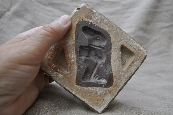 Model: Alte Marzipanform des 19./20. Jh. hier die eine Hälfte einer Gips-Hohlform für die serienmäßige Marzipanproduktion von "Osterhasen". Einwandfreier, unbenutzter Zustand. Maße: 10 x 10 x 5 cm H. Gewicht: 540 Gramm. Verfügbarkeit: 1 x in dieser Ausführung von insgesamt 11 x unterschiedlichen Modeln, alten Marzipanformen.