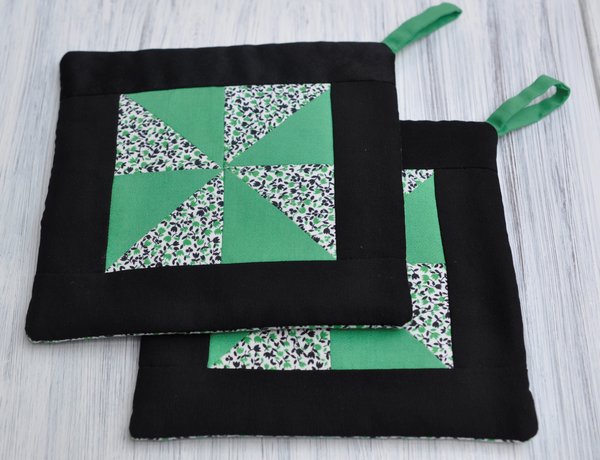 Topflappen: Paar neuwertige, mit der Maschine genähte "Topflappen" in Patchworktechnik, hier im bekannten "Windmühlenmuster". Maße: 17 x 17 cm Gewicht: 50 Gramm. Verfügbarkeit: 1 x in dieser Ausführung; weitere Paare Topflappen.