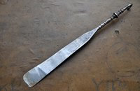 Bratenwender in Urgroßmutters Küchenausstattung: Hier von Hand geschmiedet aus einem Stück Stahl. Maße: 39 cm L; 4 cm B. . Gewicht: 200 Gramm. Verfügbarkeit: 1 x in dieser Ausführung; weitere Bratenwender / Pfannenwender.